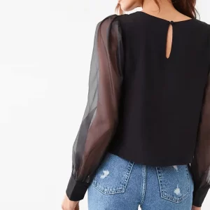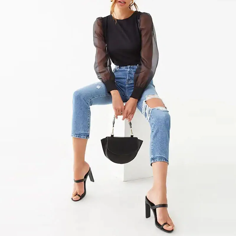 Fashion Lady Top for Women Solid O-Neck with Sheer Sleeves Casual Style Breathable Chiffon Tops