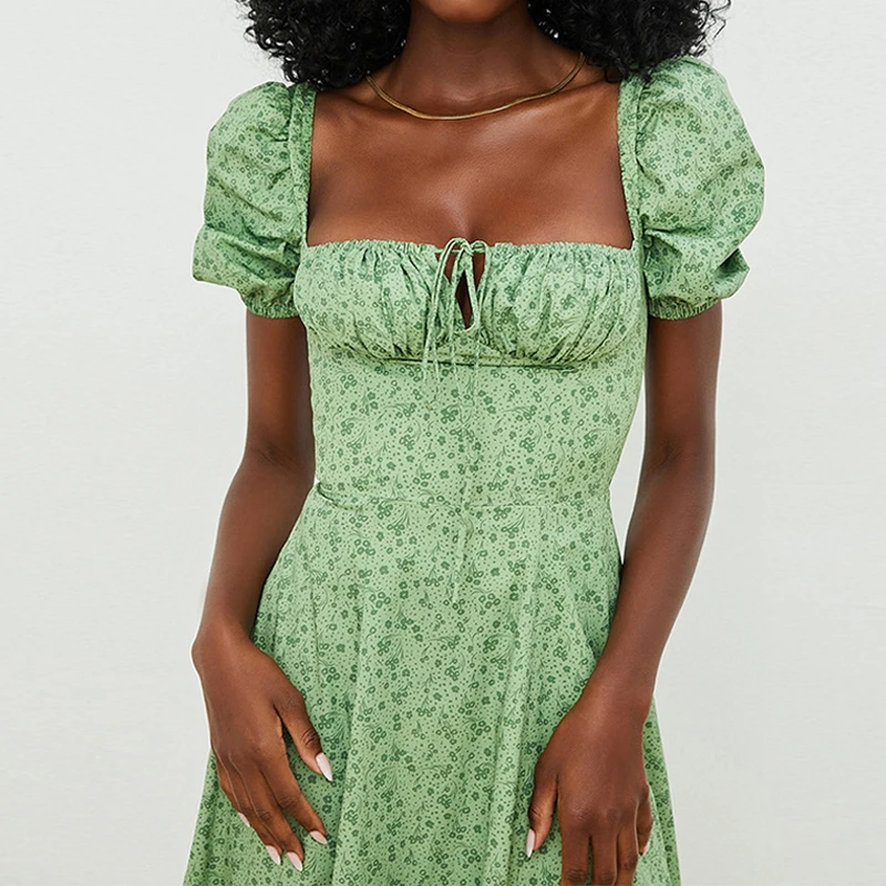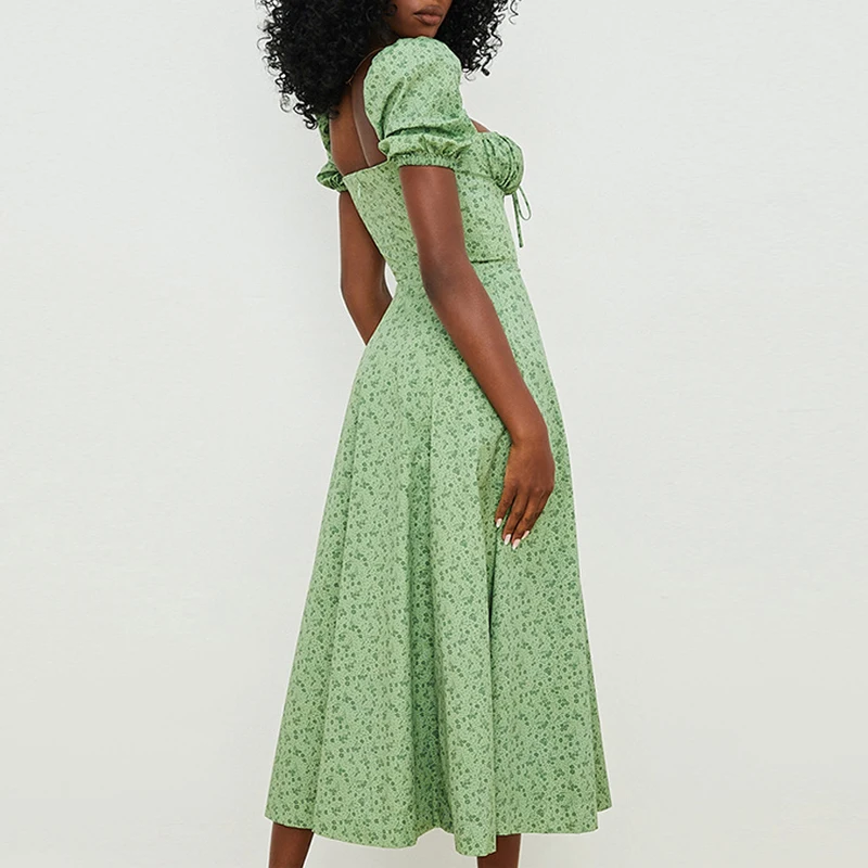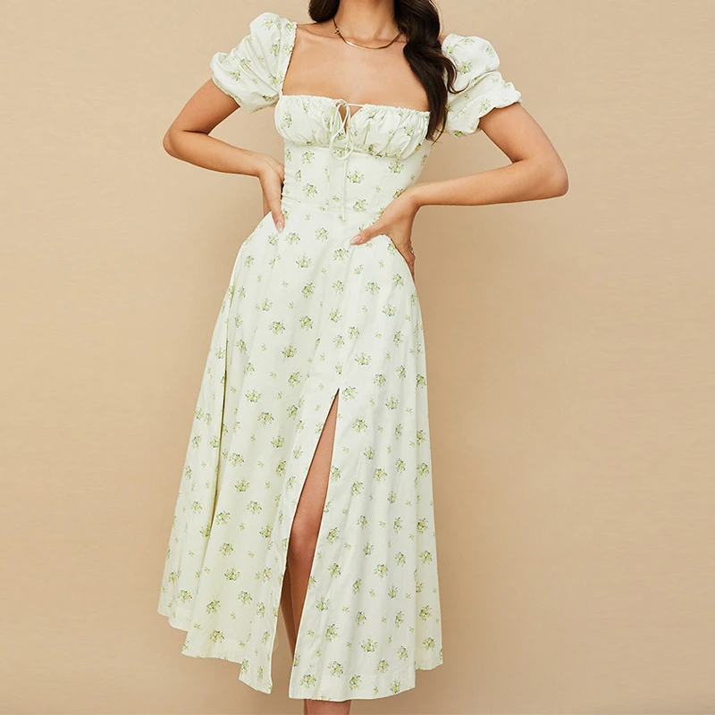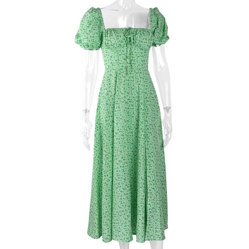 2024 Green Square Neck Puff Sleeve Slit Summer Women Casual Floral Long Dresses