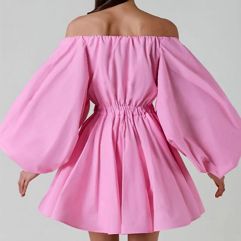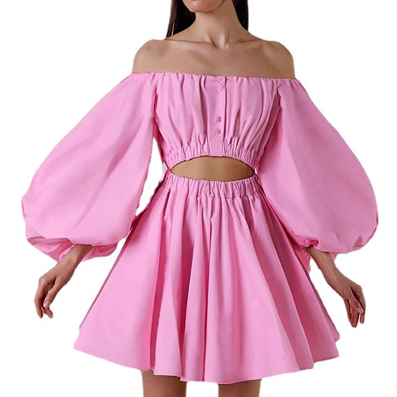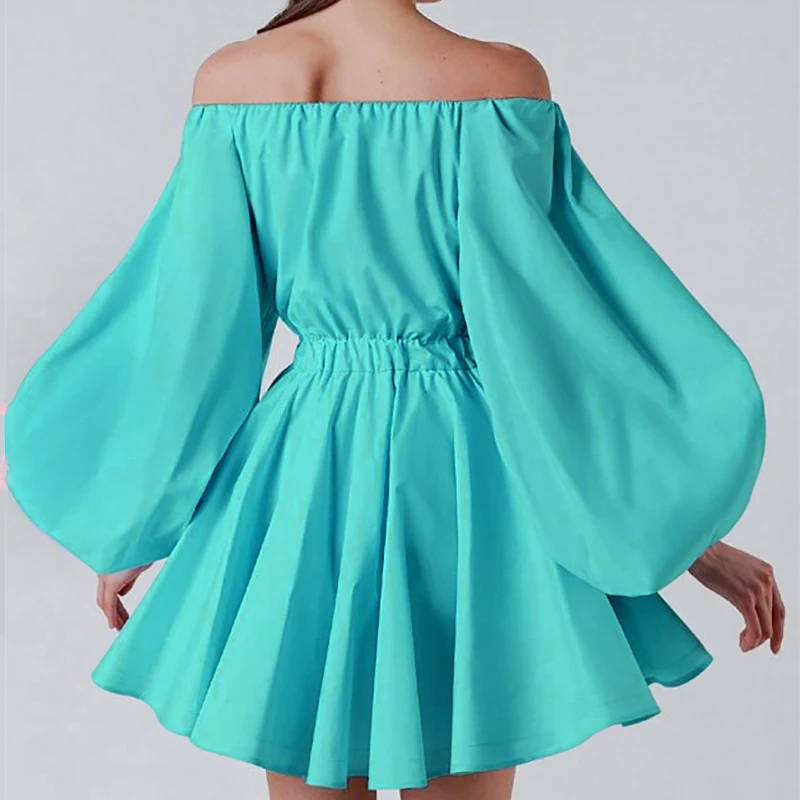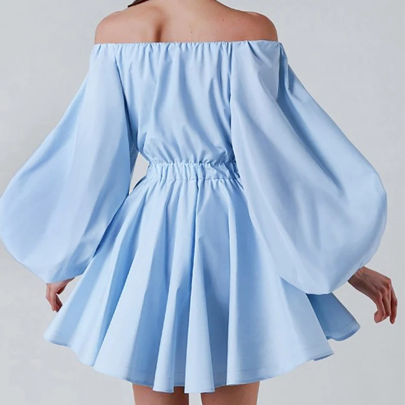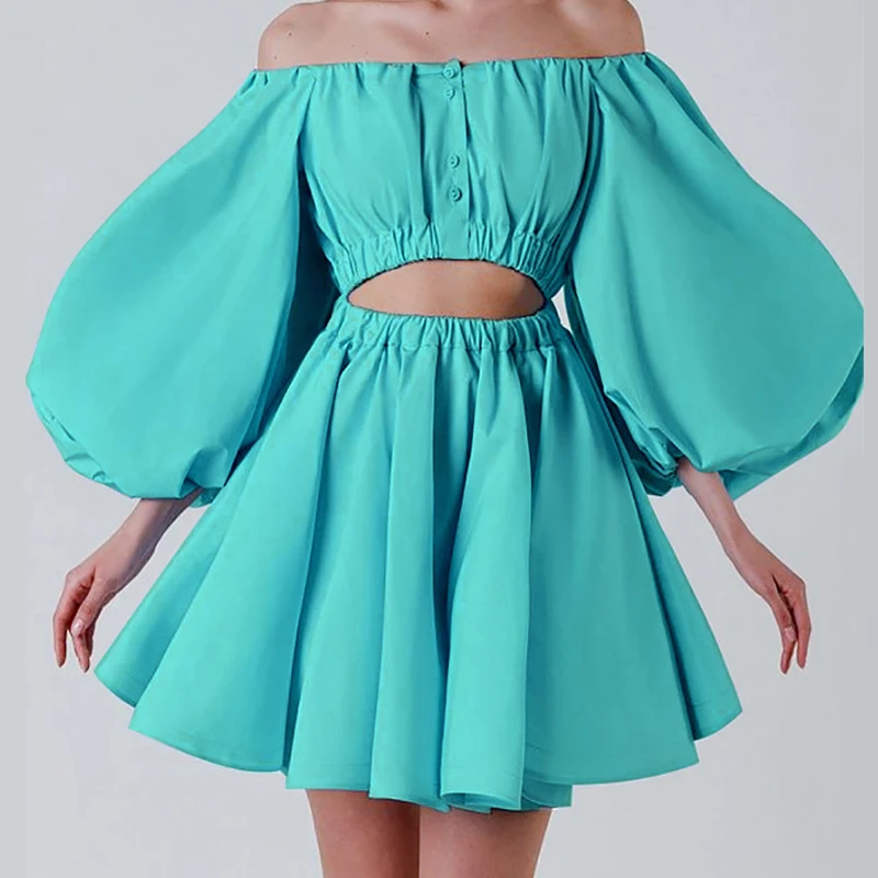 2024 Light Blue High Waist Cut Out Off Shoulder Puff Sleeve Women Elegant Sexy Casual Dresses