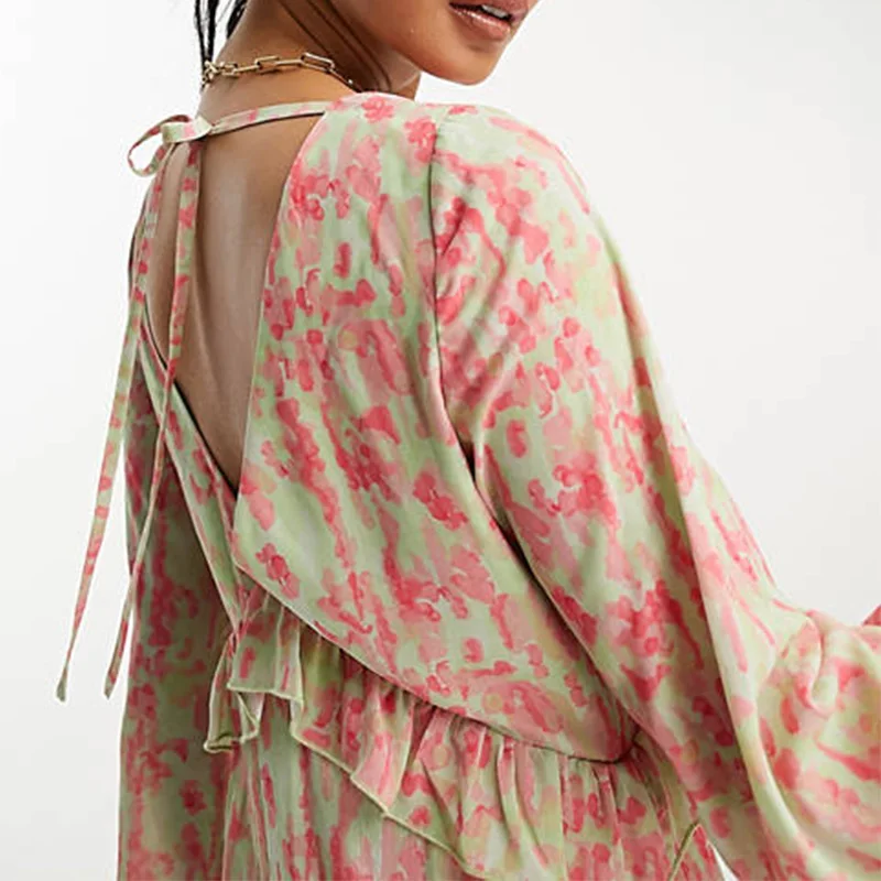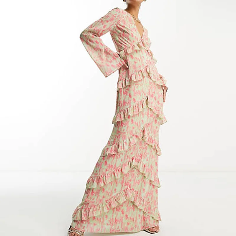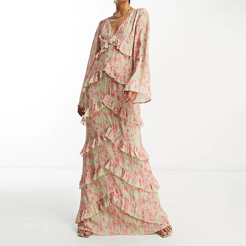 Autumn Women’s V-Neck Flared Long Sleeve Ruffle Trim Tie Back Mixed Floral Print Sexy Max Long Dress