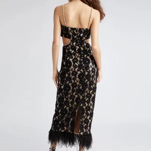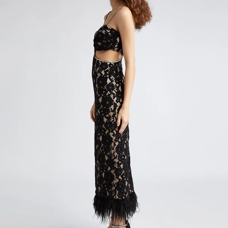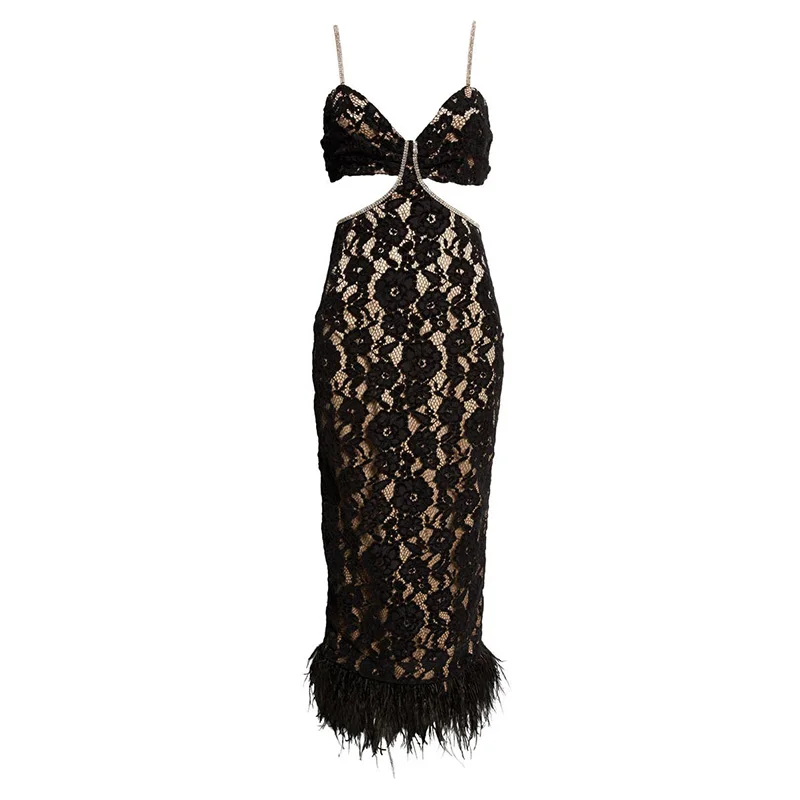 Design Lady Elegant Party Dress Rhinestone Strap Cutout Lace Feather Trim Maxi Sexy Lace Gown Women Dresses