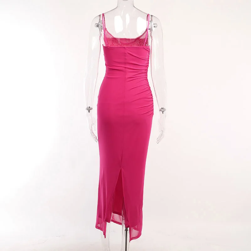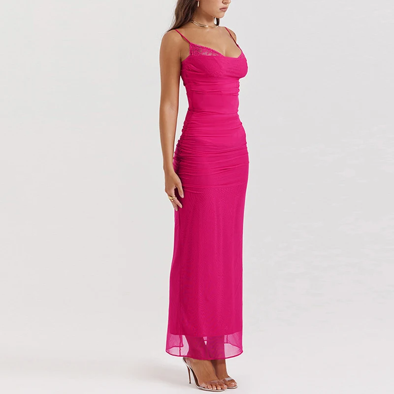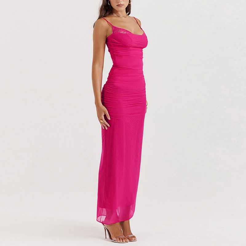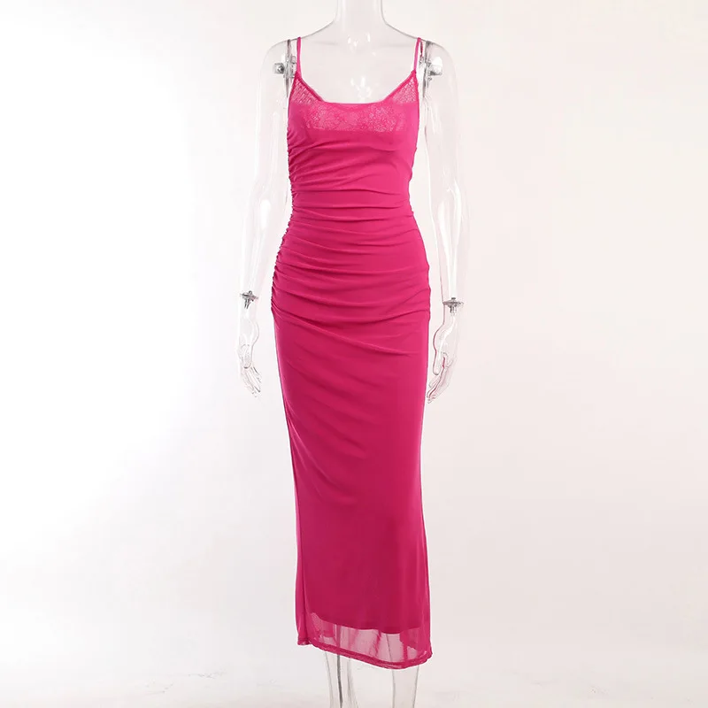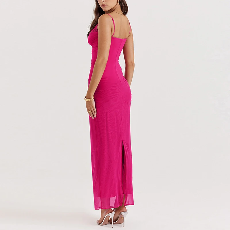 Design Strapless Slit Back Shirred Design Breathable Mesh Sexy Women Casual Bodycon Long Dresses