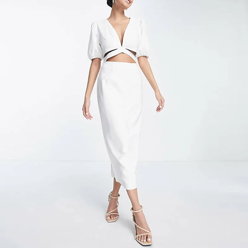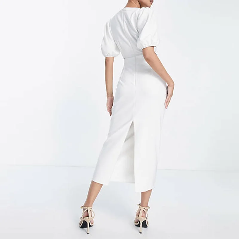 Elegant White Office Lady Pencil Plunge-Neck Cut-Out With Puff Sleeves Empire For Summer Plain Dyed Midi Dress