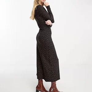 Elegant Women's V-neck Long Sleeve Pink Floral Bud Print Black Casual Max Tea long Dress
